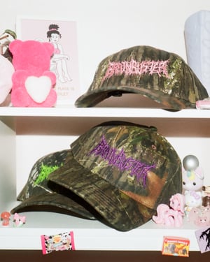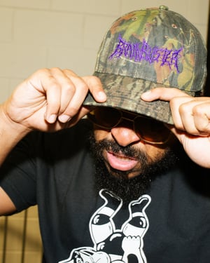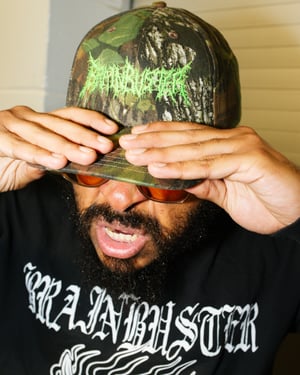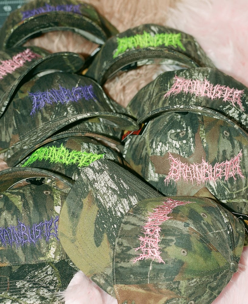Embroidered BRAINBUSTER 'metal' logo on a camouflage hat.